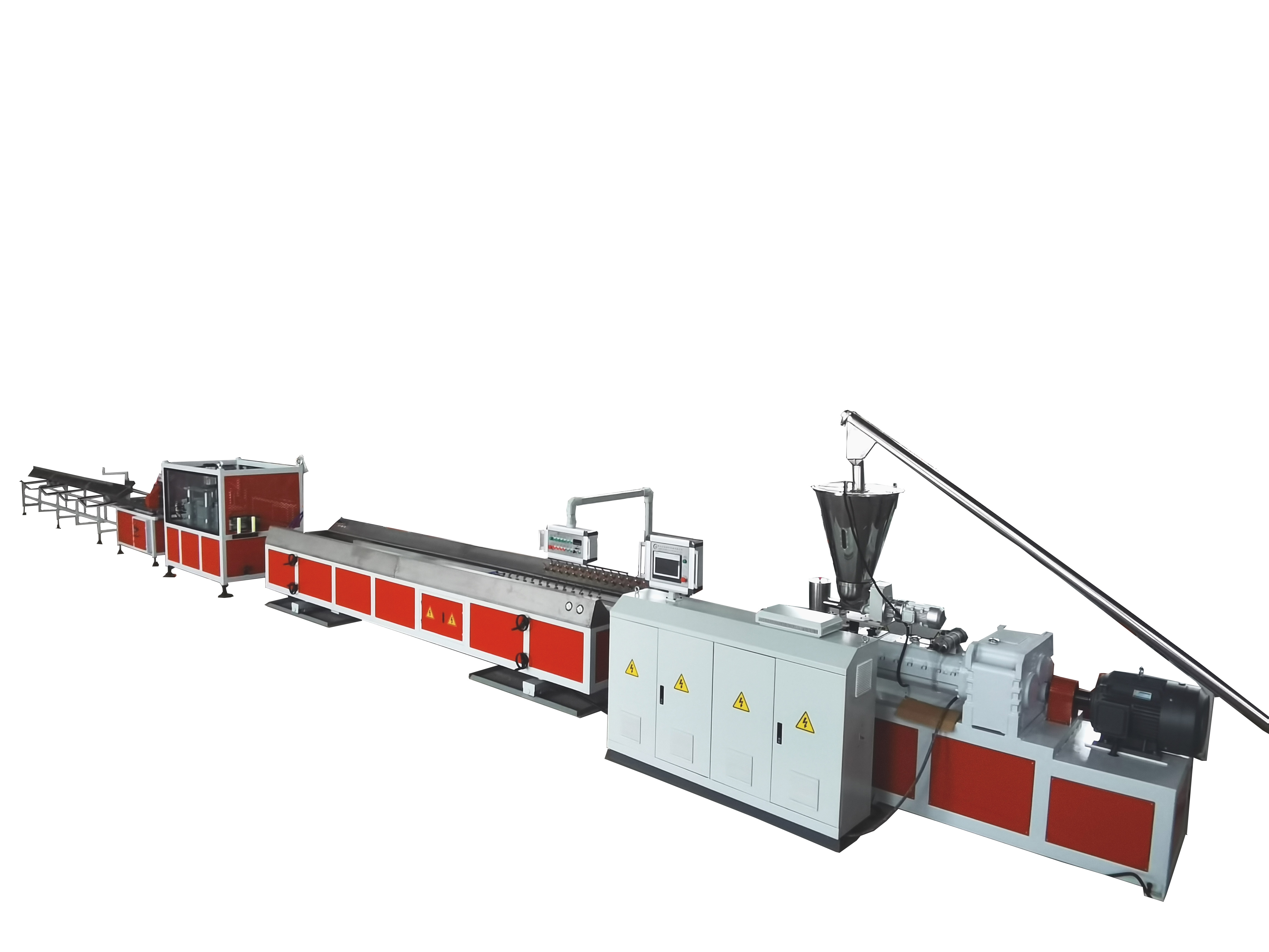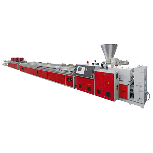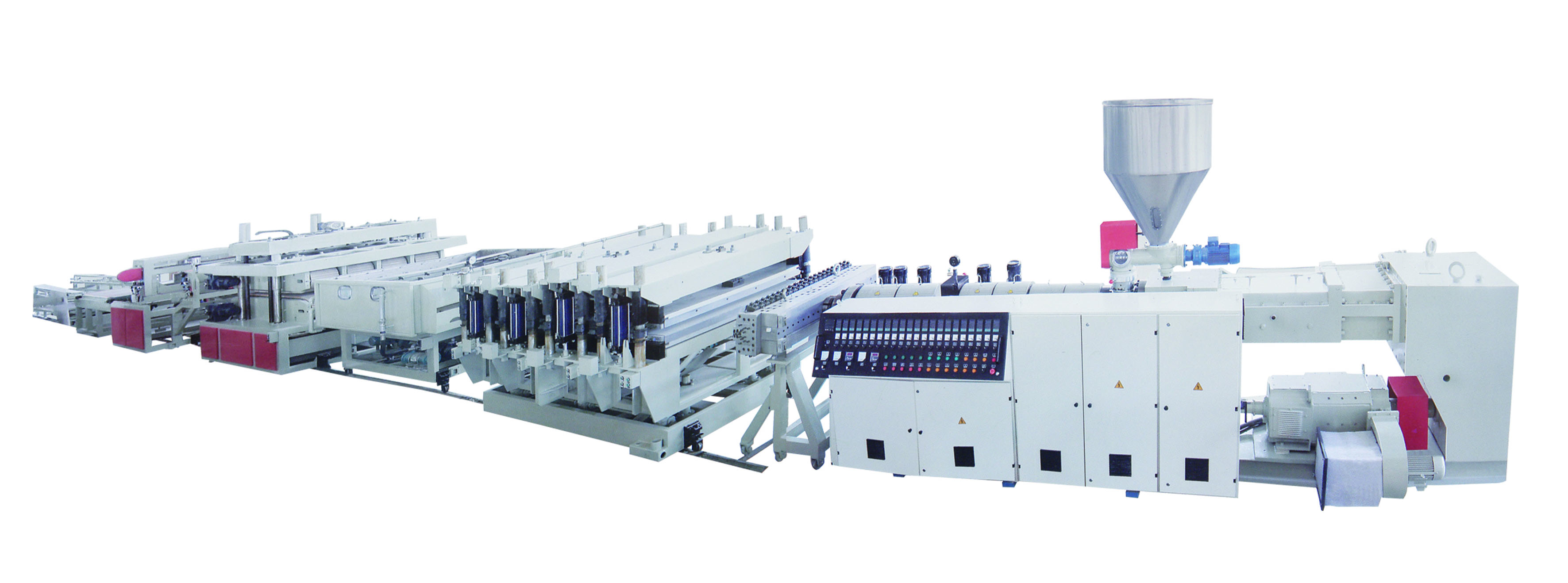中空模板生產(chǎn)線(xiàn)/中空板設(shè)備由自動(dòng)上料進(jìn)入高速混料、再自動(dòng)上料到雙螺桿擠出機(jī)、由大板模具結(jié)構(gòu)出料進(jìn)行四節(jié)定型模定型、排輥托冷裝置、裁邊裝置、牽引機(jī)、自動(dòng)切割機(jī)、排輥輸送機(jī)等組成